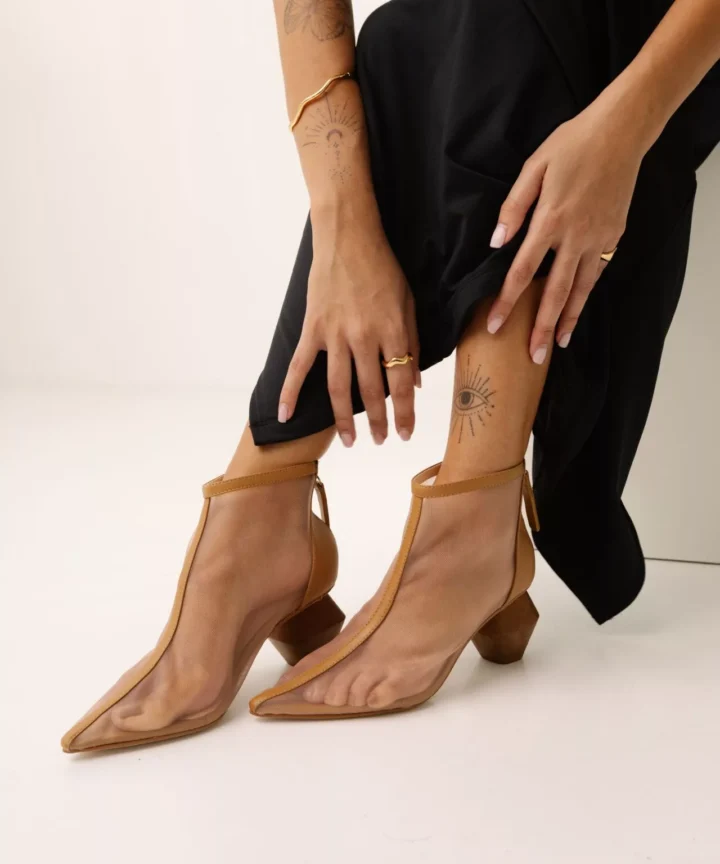 - Material Transparente: Feita em couro com detalhes em tela transparente, que oferece um toque moderno e arejado ao design.