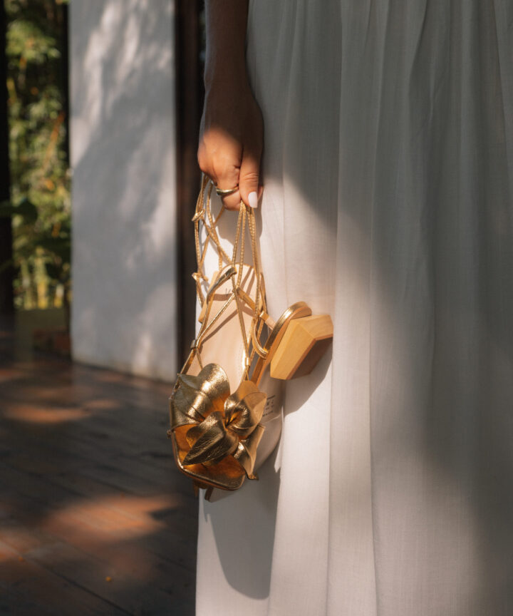- Design: Flor feita a mão frontal e tiras finas com amarração no tornozelo.