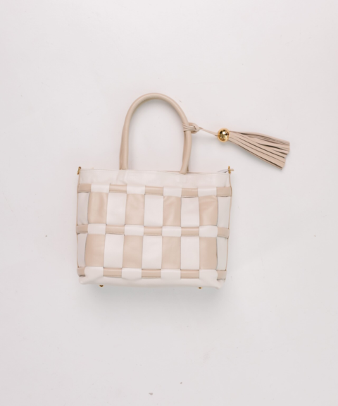 Feita em couro legítimo, seu corpo é formado por tiras largas entrelaçadas, criando um jogo geométrico de textura e contraste que se traduzem em elegância descontraída. O modelo apresenta alça estruturada, pendente em couro com esfera metálica dourada e base reforçada com pés de apoio, detalhes que garantem durabilidade e sofisticação. O fechamento com zíper mantém seus itens seguros sem comprometer o visual limpo e moderno.