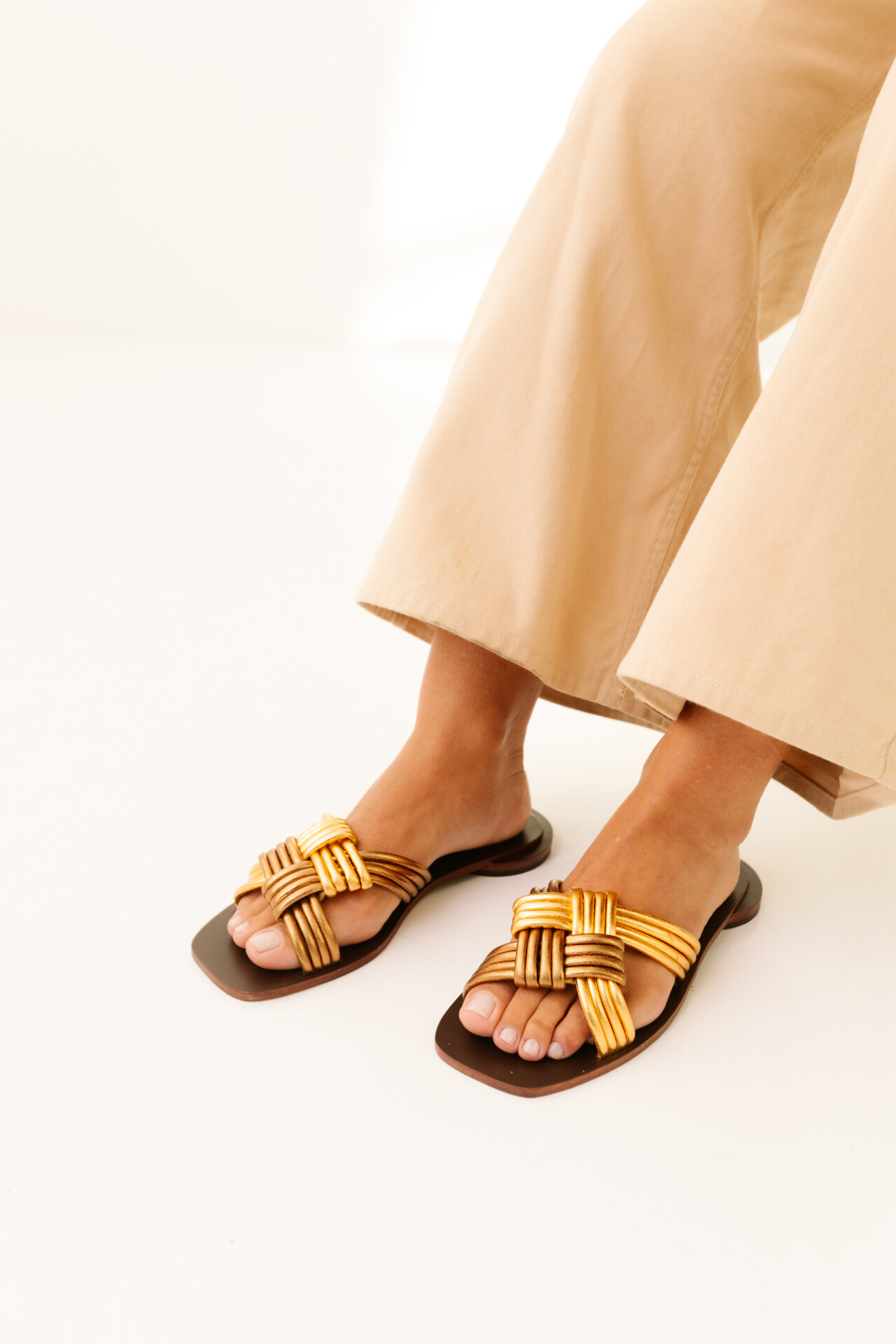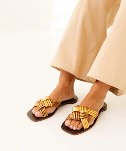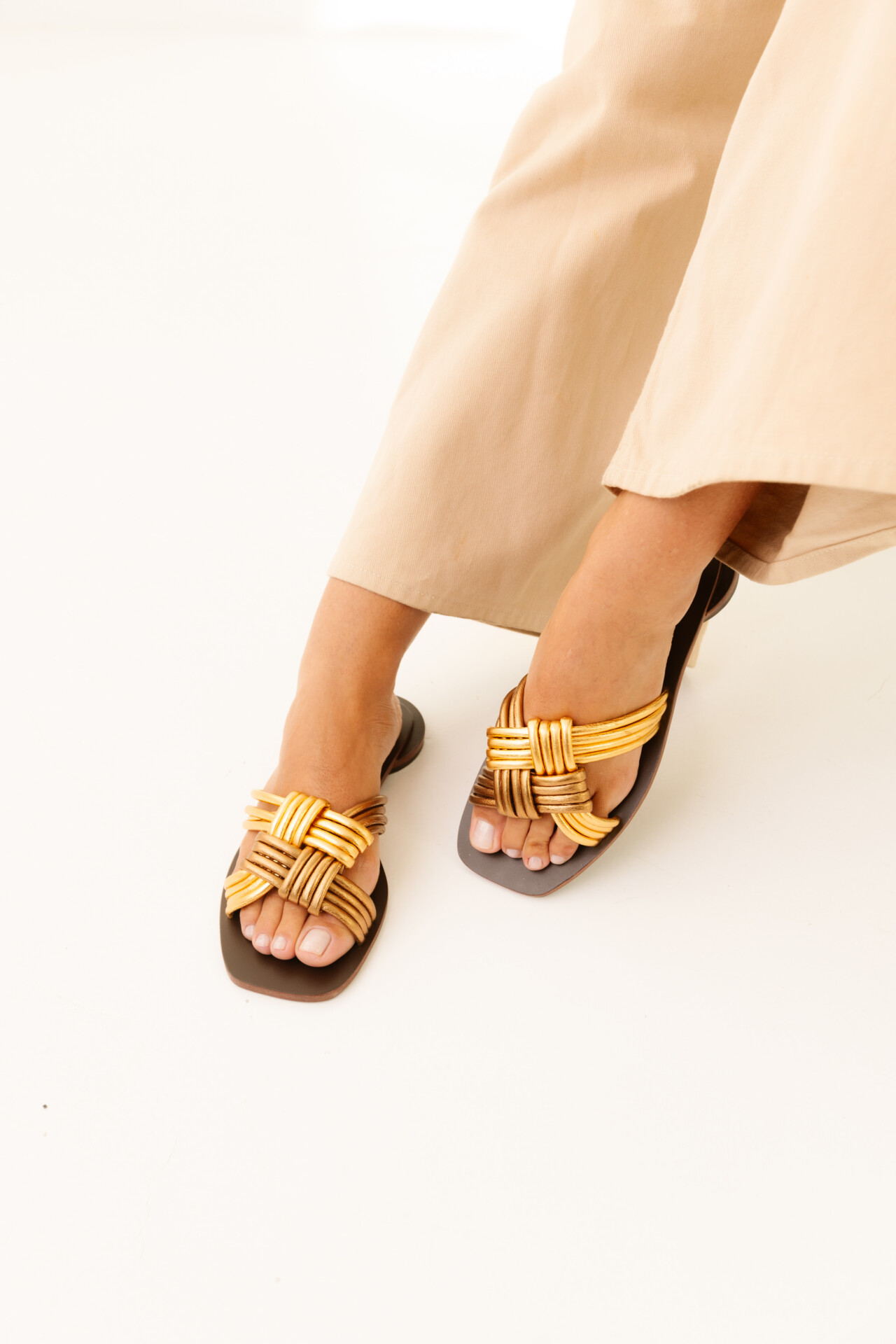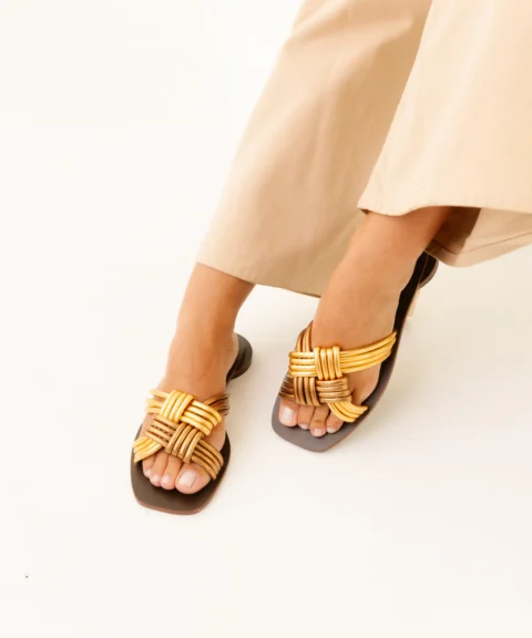 A Rasteira em Couro Alfiere é expressão de presença nos detalhes. Seu design entrelaçado em couro cria um jogo de volumes e direções que transforma o simples em sofisticado. A combinação de tons, do dourado luminoso ao neutro elegante adiciona profundidade à peça, refletindo a luz com sutileza e trazendo um toque contemporâneo à composição. O acabamento manual evidencia o cuidado em cada traço, reforçando o caráter autoral do modelo.