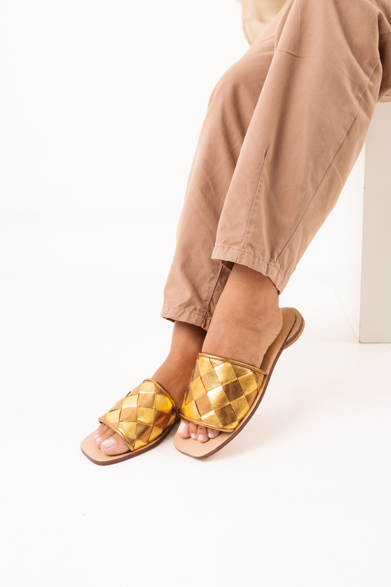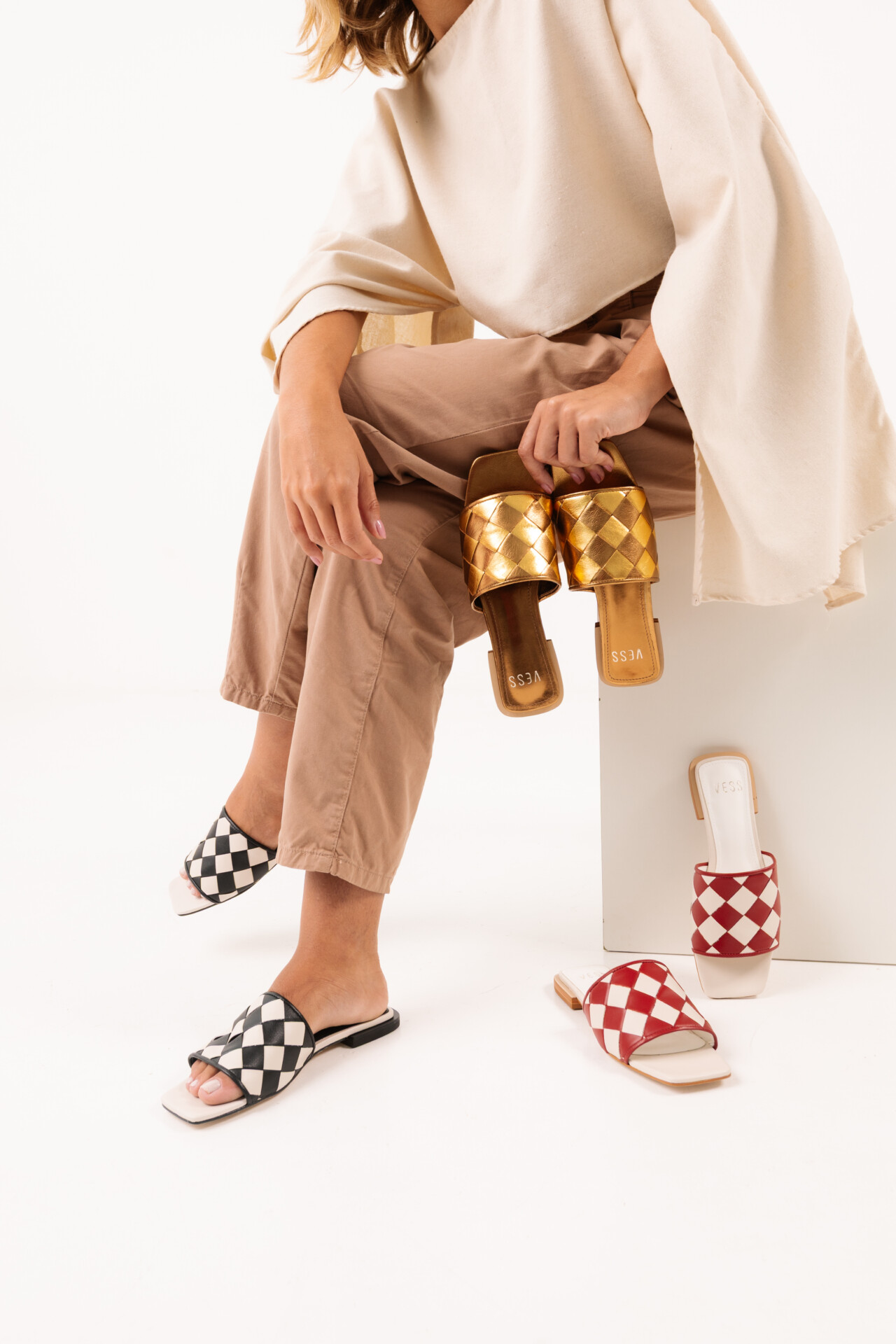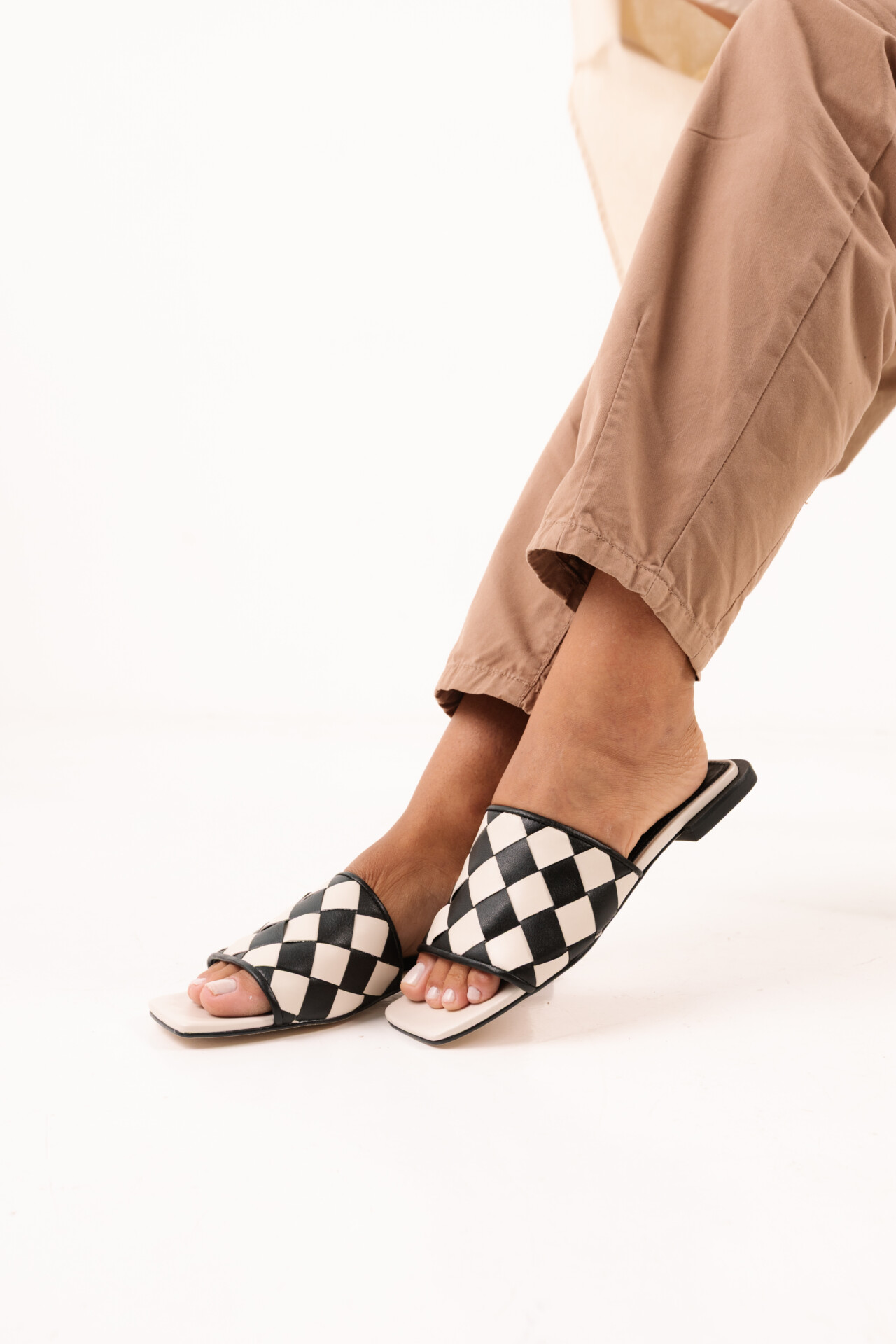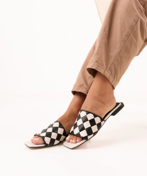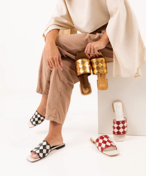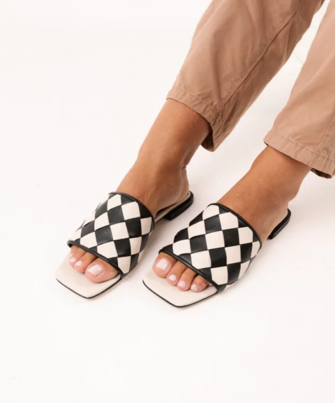 A Rasteira Feminina em Couro Monaco Xadrez tem bico quadrado em couro legítimo artesanal no icônico estampado xadrez em cores diversas. A tira larga acolchoada garante conforto o dia todo, enquanto o design geométrico traz personalidade e versatilidade — combina com looks casuais, alfaiataria e jeans. Acabamento artesanal com solado baixo e palmilha macia.