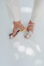 - Design: Flor feita a mão frontal e tiras finas com amarração no tornozelo.