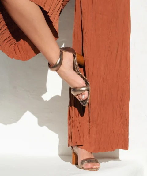 Elegância escultural, presença atemporal. A Sandália em Couro Feminina Riace traduz a essência do design sofisticado em uma peça marcante e feminina. Confeccionada em couro nobre com acabamento metalizado, ela envolve o pé com tiras suaves e estruturadas que valorizam a silhueta com delicadeza. O destaque fica para a tira acolchoada no tornozelo, que cria um efeito visual contemporâneo e sofisticado, enquanto a tira frontal mantém o design minimalista e elegante. O salto médio em madeira natural acrescenta autenticidade e equilíbrio, trazendo conforto e estabilidade ao caminhar. Uma sandália que transita com naturalidade entre o refinamento do dia e a elegância da noite.