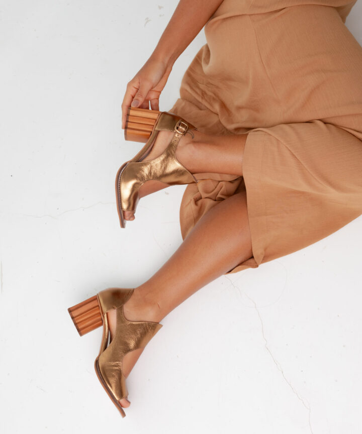 ✔ Salto: Médio de 7cm, em bloco geométrico de madeira para mais estabilidade e estilo