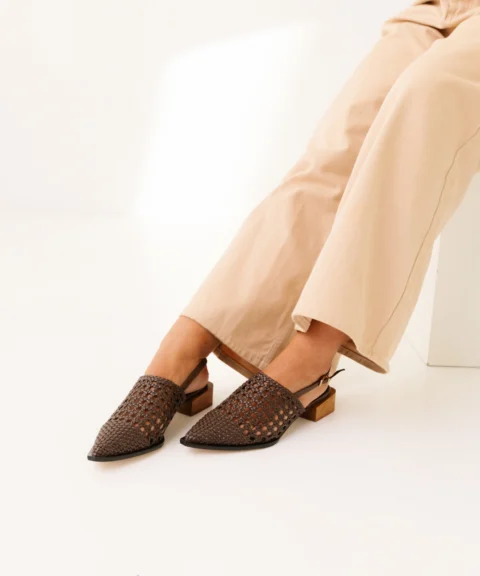 O Sapato Slingback em Couro Poulaines revela a sofisticação nos detalhes que se entrelaçam. Seu cabedal em couro trançado cria uma textura rica e delicada, que envolve o pé com leveza e revela, de forma sutil, a pele. A silhueta slingback equilibra estrutura e fluidez, enquanto o bico alongado traz elegância à composição. O salto em madeira completa o design com naturalidade, reforçando a estética artesanal que define a peça.