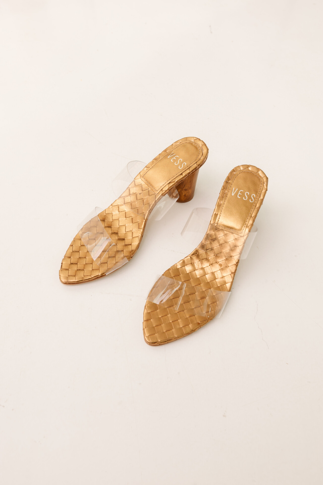 A base em couro com efeito tramado metalizado eleva imediatamente qualquer produção, trazendo um luminoso dourado que reflete movimento de forma sutil e elegante. A tira em vinil, quase invisível, cria o efeito nude elevado, revelando o pé com naturalidade e alongando a silhueta, ao mesmo tempo em que mantém firmeza e conforto. O bico fino adiciona modernidade, enquanto o salto em madeira, acabamento assinatura da Vess, entrega equilíbrio entre design contemporâneo e estética artesanal.