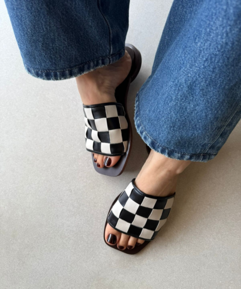Um clássico que une arte e design. O Tamanco Feminino em Couro Artemis celebra a estética do xadrez de forma elegante, com tiras largas confeccionadas em couro nobre entrelaçado nos tons preto e off-white, criando um visual marcante, sofisticado e atemporal.